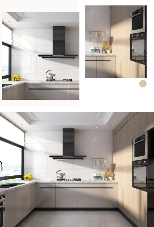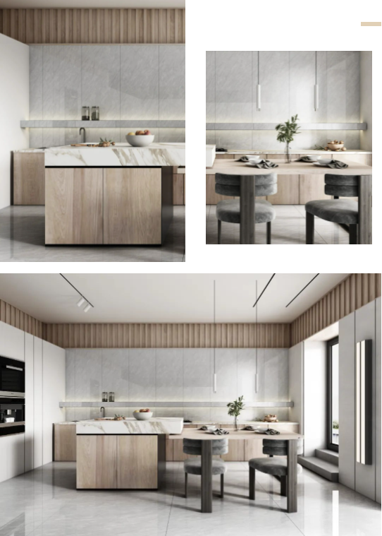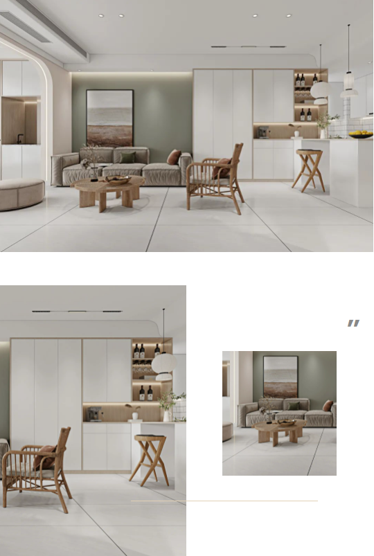 牆麵通體瓷拋石中板馬特拉,清爽的色調既拓寬了廚房的空間感,一石多麵又增添了些許靈動,在陽光照射下,與暖調木紋互相輝映,建立起空間與自然之間的聯係,讓每次下廚都成為期待。
