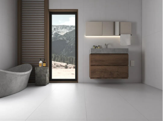 以簡單純粹的姿態,洗去繁忙工作和喧囂日常帶來的疲憊感。750x1500mm西江月通鋪浴室,細沙幹粒半拋帶來的天然質感搭配原木色浴室櫃,幹淨配色與極簡設計,為空間打造與眾不同的寧靜時光。
