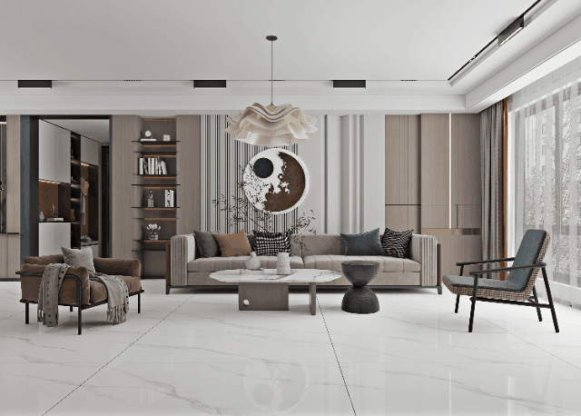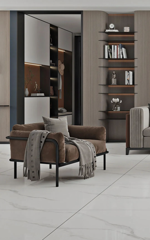 冰河白作為主調的空間,不禁讓人幻想起極其純淨的山河冰川。設計師帶著對自然風光的憧憬,將行雲流水般的石紋糅合在瓷磚的表麵上,展現出如夢似幻的地貌特色,帶來非凡體驗。