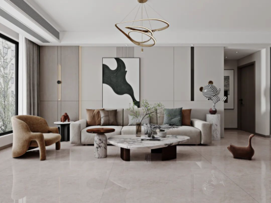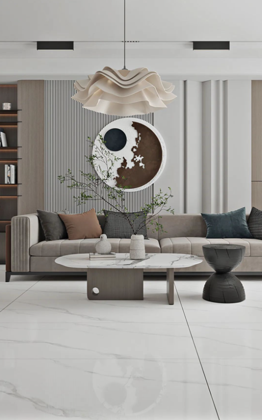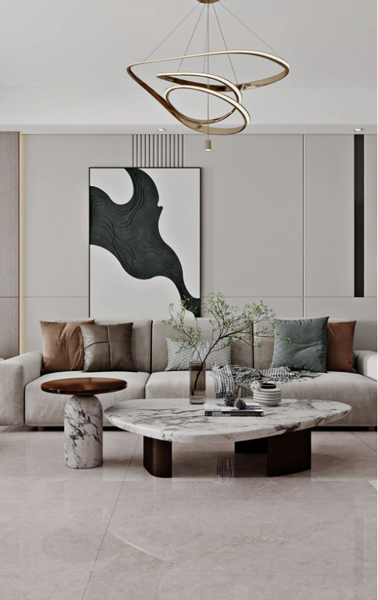 地麵的主角哈爾施灰,飄逸的紋理,如無拘無束的靈魂,隨性優雅。深淺不一的自然過渡,配合頗具檔次的不規則燈具、絨布沙發以及大膽有趣的抽象畫,讓空間充滿時尚,不落俗套。