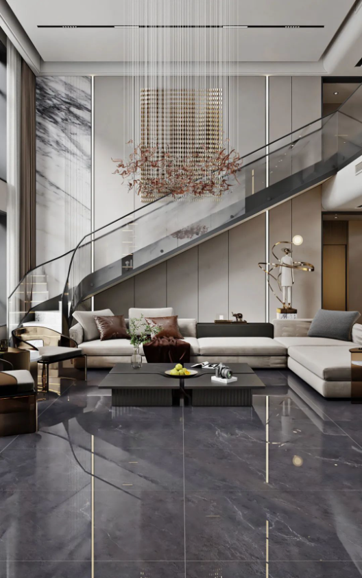 客廳采用挑高設計,不僅能增強室內采光效果,同時突出空間錯落有致的層次感,讓客廳高級感瞬間拉滿,加上斯克深灰獨一無二的紋理,無論檔次、質感、氣場,都透露著別具一格的藝術氛圍。