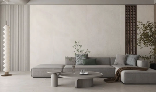 牆麵選用750X1500mm規格的宋素|凡古磚綺羅香,整體基調偏向淺色係,搭配原木色等主體色,仿佛呼吸著大自然的氣息,領悟塵世喧囂中的靜謐。